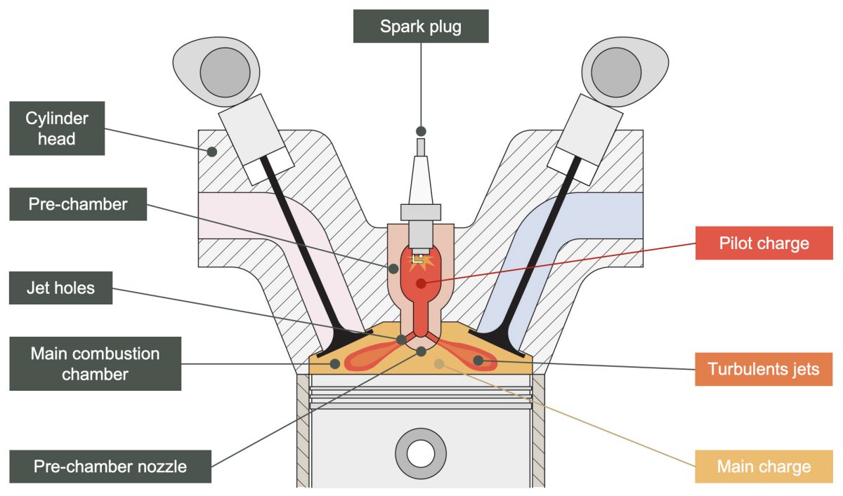 This pilot charge is ignited by a spark plug. As it burns, it emits flame jets into the engine’s main combustion chamber through the orifices. These jets - known as “turbulent jets” or “ignition torches” - ignite the main charge: