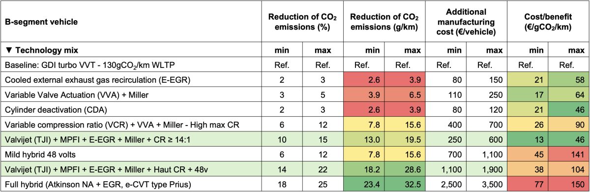 As shown in this table, compared with a modern GDI turbo VVT engine, TJI implemented with Valvijet delivers a major reduction in fuel consumption, and does so at the lowest cost per gram of CO2 avoided. When combined with a 48-V mild-hybrid system, Valvijet can even match the fuel-consumption reduction of a full-hybrid system while offering a manufacturing cost increase that is only half as high.